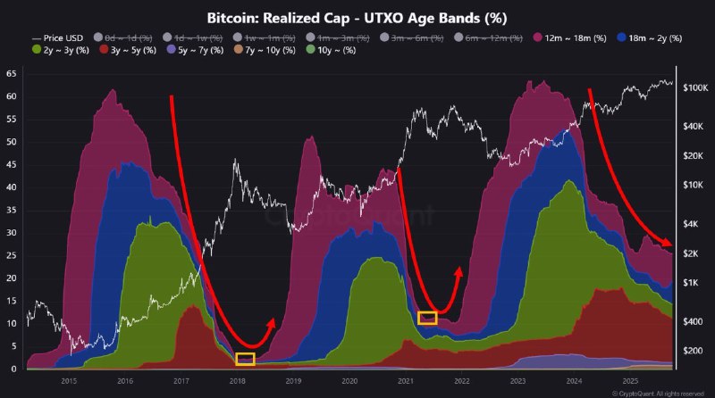 В прошлые циклы на завершающих стадиях бычьего рынка резко сокращалась доля монет, удерживаемых более года — инвесторы фиксировали прибыль, приходил новый капитал, росла ликвидность. Сейчас этот показатель снижается постепенно, что говорит о том, что до пика ещё далеко.