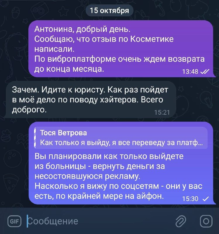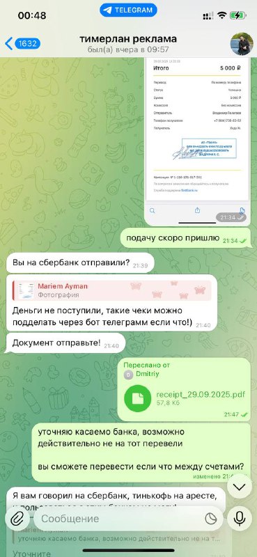 А затем игнорируют сообщения, удаляют чат и оставляют деньги себе, будьте осторожны, у них ещё много других пособников 🙏