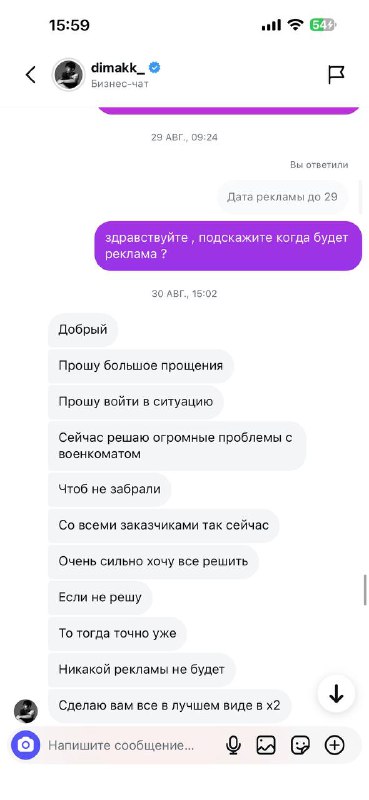 Хочу поделиться своим крайне негативным опытом сотрудничества с блогером https://www.instagram.com/dimakk_/. Надеюсь, мой отзыв предостережет других потенциальных рекламодателей от подобных ошибок и поможет избежать потери времени, нервов и, самое главное, денег.