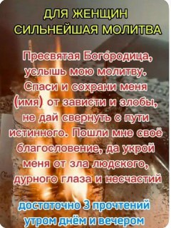 "Пресвятая Богородица, защити. От беды, от невезения от человека злобного, сохрани. Пойду по пути светлому, куда Ангелы поведут, на мои дела любые удачу навлекут. Истинно."