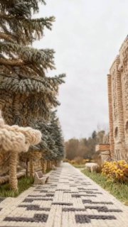 Это история про родной город, сделанная из шерстяных ниток, кругом связанные сосны, дорожки, бульвар Мирабель, гостиница, дом культуры, детский парк со знаменитой ракетой. И даже связанные из шерсти облака.