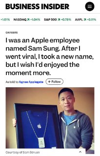 Фото его бейджа с подписью «Apple — Sam Sung» стало вирусным, интернет взорвался мемами, но руководство юмора не оценило. Саму велели сменить имя на бейдже и изъяли визитки.