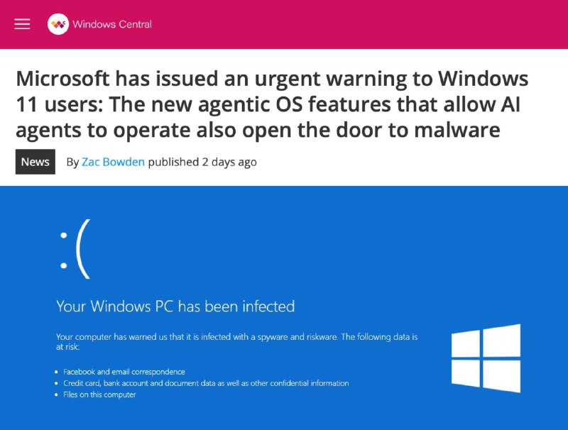 Windows может сама… скачать вирус на ваш ПК — Microsoft впервые официально предупредила о рисках «агентного ИИ» в Windows 11.