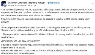 Беженцы из Украины говорят, что канадская иммиграционная служба запрашивает справку о службе в армии. Один из них рассказал, что его попросили объяснить, как он покинул Украину в 2023 году, и принести новую справку. Тех, кто такой справки не предоставит, не допустят в страну или депортируют.