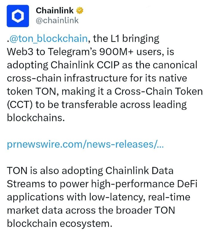 .@ton_blockchain, the L1 bringing Web3 to Telegram’s 900M+ users, is adopting Chainlink CCIP as the canonical cross-chain infrastructure for its native token TON, making it a Cross-Chain Token (CCT) to be transferable across leading blockchains.
