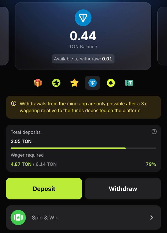 Withdrawal of TG Stars or TON is possible after completing a wager relative to deposited funds.
