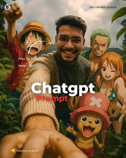 “Create image. A fisheye lens selfie photograph of a young Indian man wearing a woolen two-tone sweater (beige and green), smiling naturally, outdoors surrounded by Monkey D. Luffy, Roronoa Zoro, Nami, and Tony Tony Chopper from One Piece. Everyone is making happy, playful faces. The scene is set in a lush green hilly landscape with tea plants, trees, and cloudy skies. Ultra-wide perspective with hand reaching toward the camera. Stylized realism blending anime characters seamlessly into a photorealistic setting. Cinematic lighting, sharp focus, DSLR depth of field, warm natural tones, high detail.”